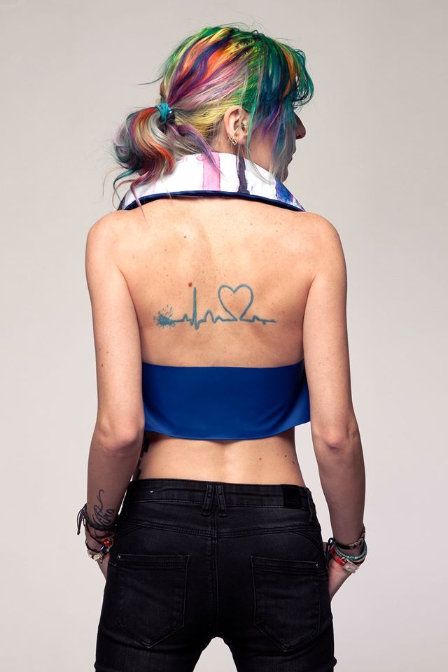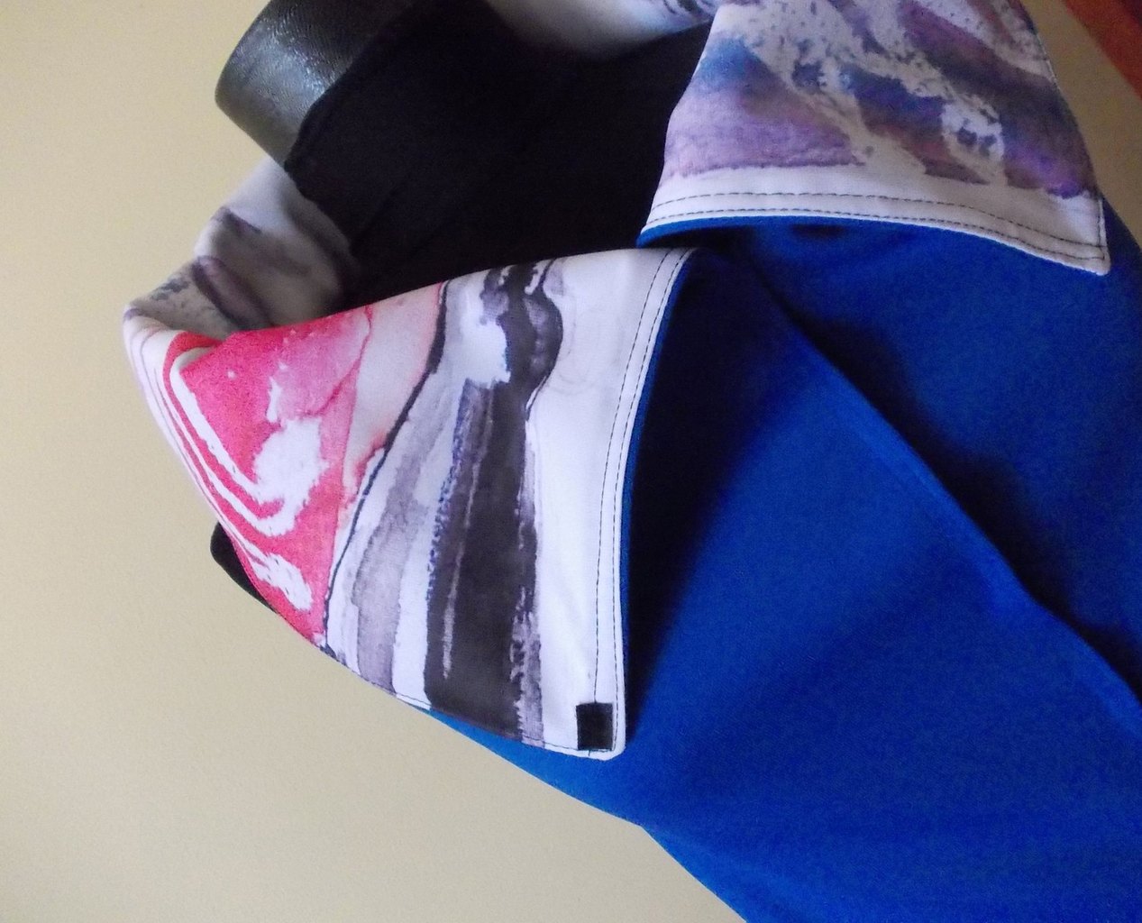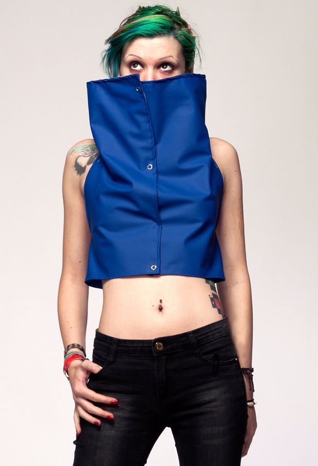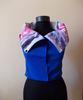 Интересно бюстие/потник с закопчаване тик-так отпред и висока яка с шарена подплата оригинален авторски принт. С гол гръб. Може да бъде поръчано с закопчаване - лепенка велкро.