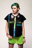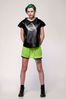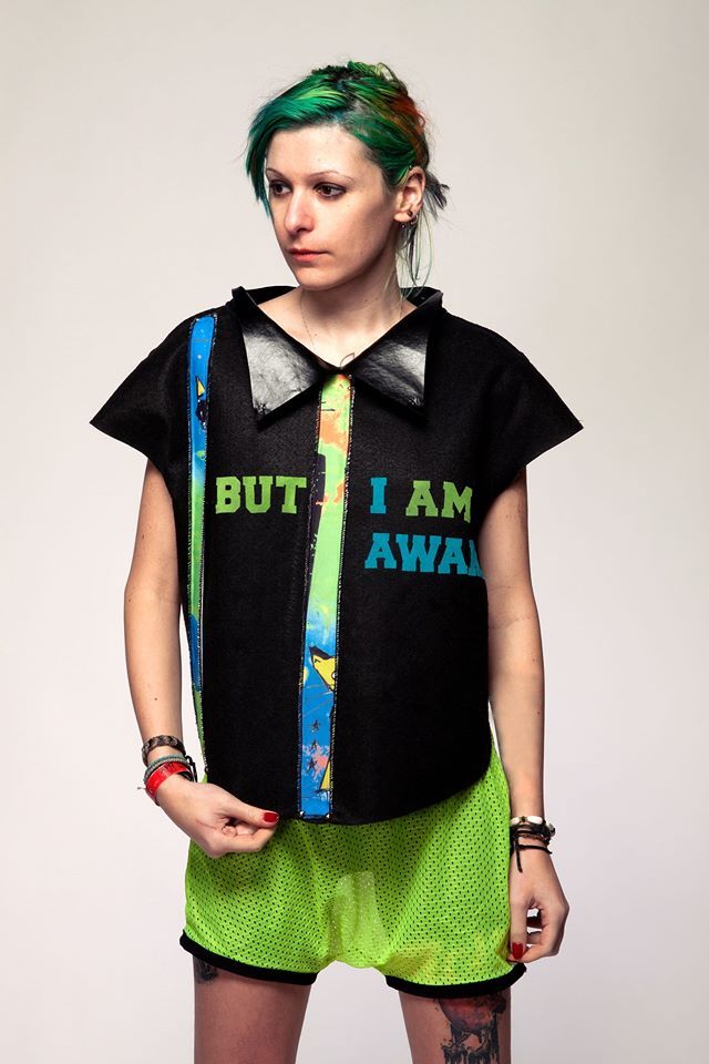 Оригинална блуза с къс ръкав от еко-кожа с две лица. От вътрешната страна материята е мека с надпис и шарени ленти. Яката може да се обръща и от двете страни.