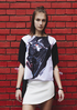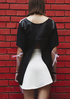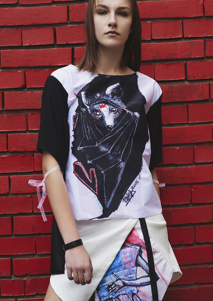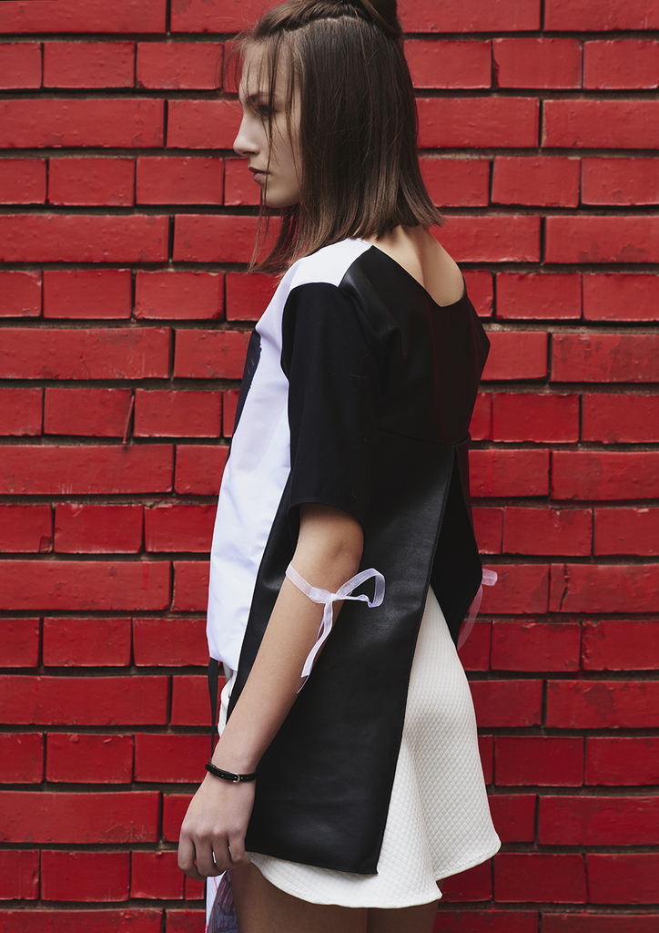 Блуза с ръкав с авторска щампа прилеп и интересен гръб тип фрак изработен от еко кожа.