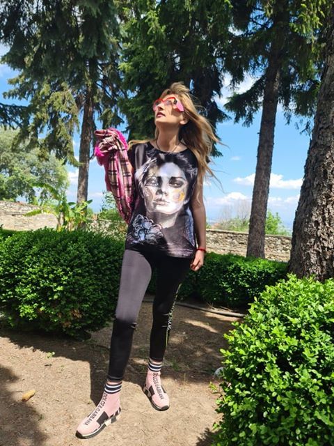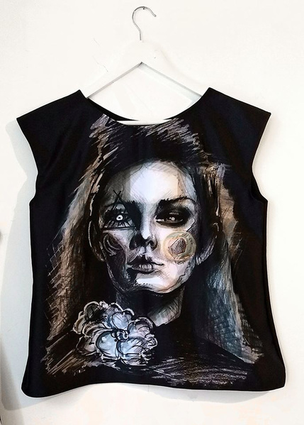 Блуза с авторски принт . Материал предна част - полиестер, мек с лека лъскавина немачкаемо. Гръб - разтеглива материя - трико 95 % памук, 5 % еластан. Може да се поръча в размер S,M,L.XL,XXL. Време за изработка 7 дена. Стандартна дължина под кръста