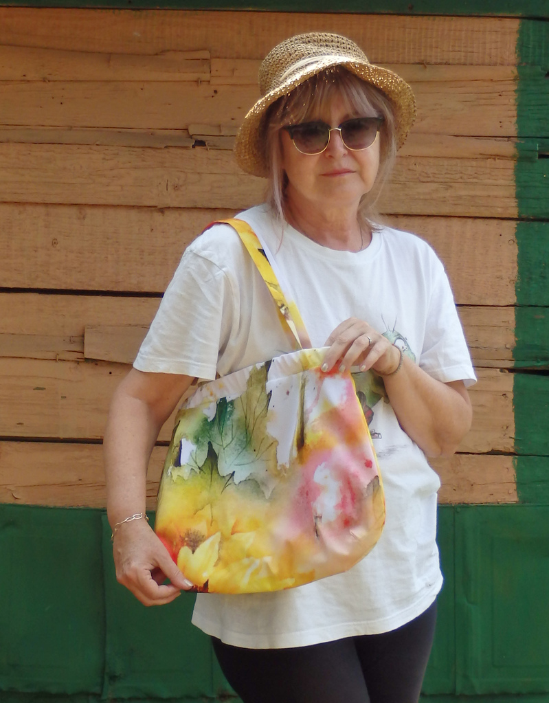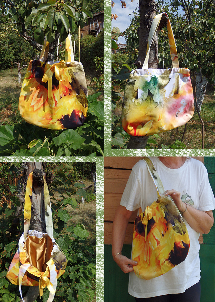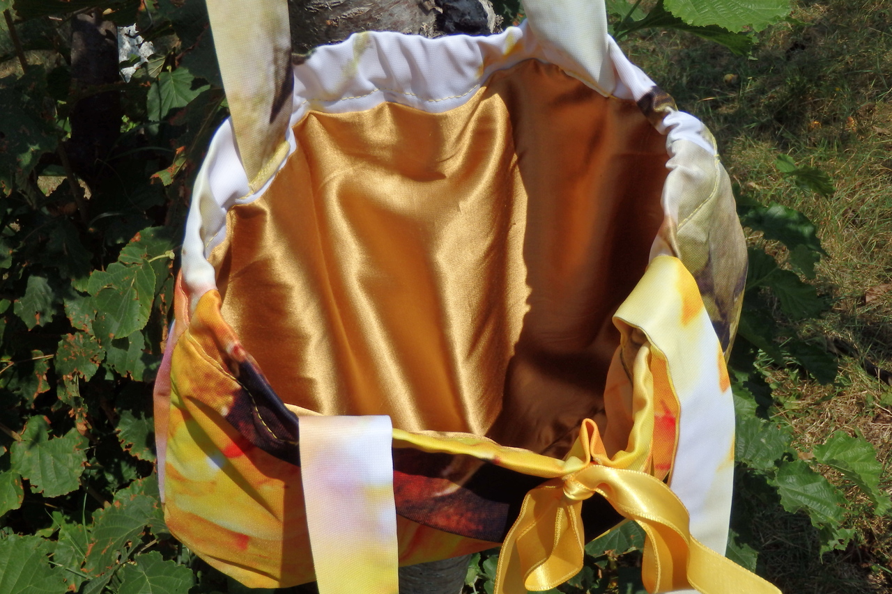 Чанта тип торба с дълги дръжки с принт СЛЪНЧОГЛЕДИ украсена с панделка с която се набира отгоре ,отвътре с подплата, подходяща за града, за плаж , за пазар. Може да бъде изработена с друг принт по желание. Размер: широка 33 см; висока 38 см ;дължина на дръжките 60 см