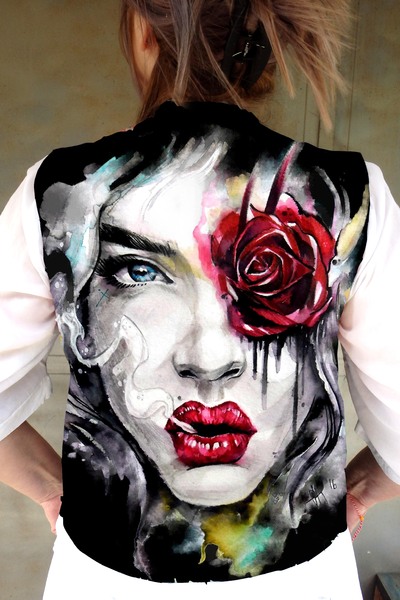 Елек с авторски принт Лице с Роза Материал фина кожа . подходящ аксесоар за всички сезони , едно прекрасно допълнение към рокля или блуза.