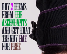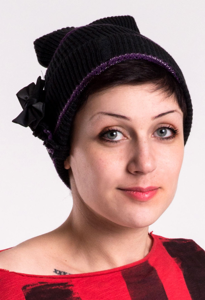 Knitted hat with ribbon, color-black with thin purple thread. If you buy two items from the collection THE ASCENDANTS will get the hat as a gift.