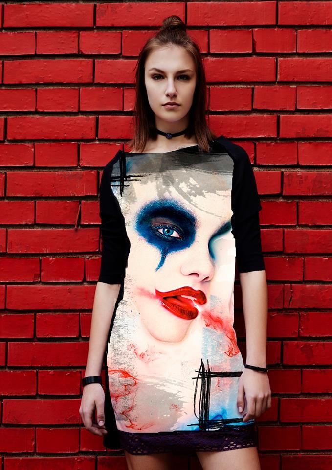 Back and sleeves are from cotton jersey fabric, opaque, 260 g/m2, stretchable. Printed area is Backlit Textile Polyester, opaque, semi-gloss,260 g/m2, slightly stretchable. Decorated with lace.