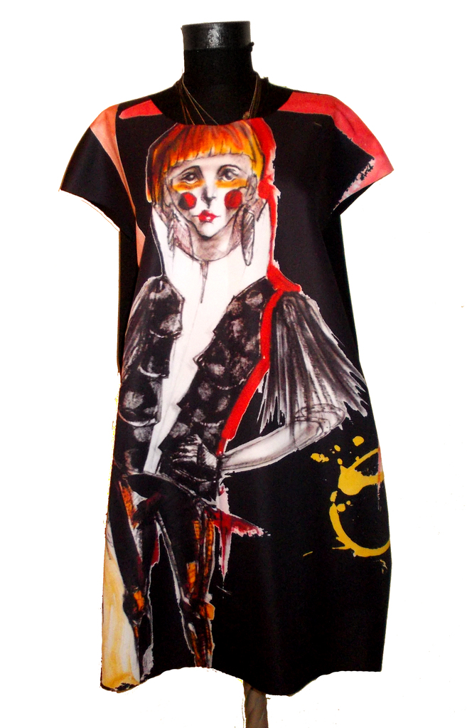 Handcrafted short dress/tunic with original art digitally printed on it. Material : back - cotton jersey fabric, printed front - polyester, non-stretchable,imitates denim, 240 g/m2. This item can be ordered with 3/4 or long sleeves, if you want sleeves to be added , please specify in the field "another"