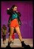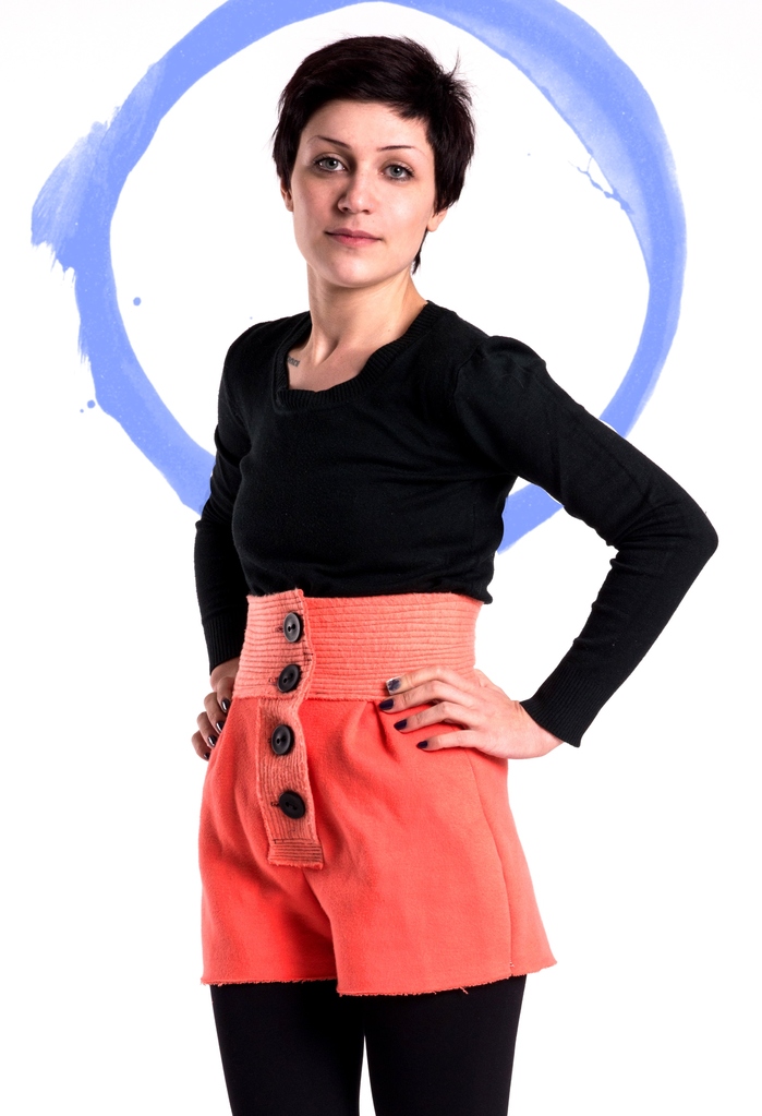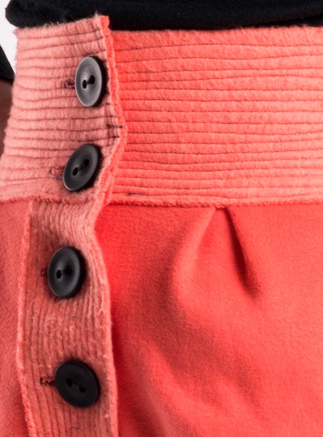 Orange pants made of thick cotton quilted fabric retro style with high waist and big black buttons in front.