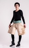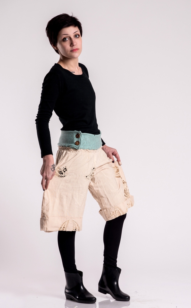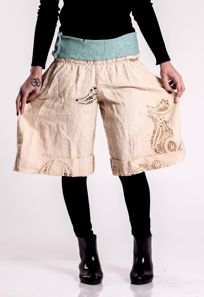 Women wide shorts with high waist from 100% natural cotton with hand crocheted lace elements in the legs. Belt stretchable knitted fabric - elastic and green cloth, wooden knobs attached on both sides.