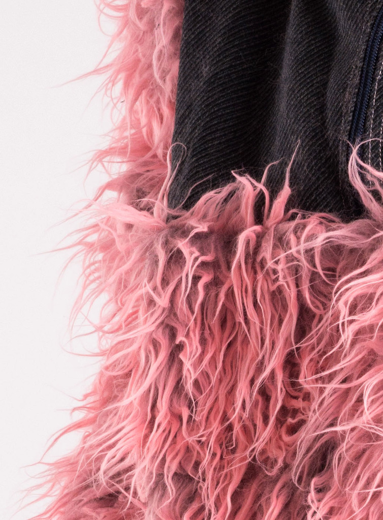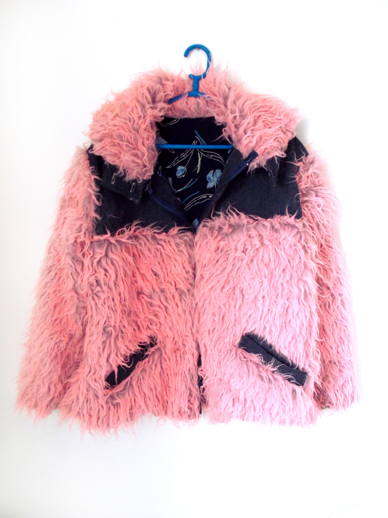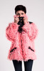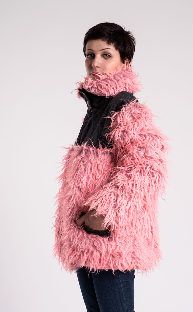 Розово пухкаво яке с гарнитура от черен вълнен плат, висока яка, два джоба с филетки в предната част. Подплатата е от плат с десен на цветя. Закопчаване с цип. Изчерпан . Модела не подлежи на повторно изработване.