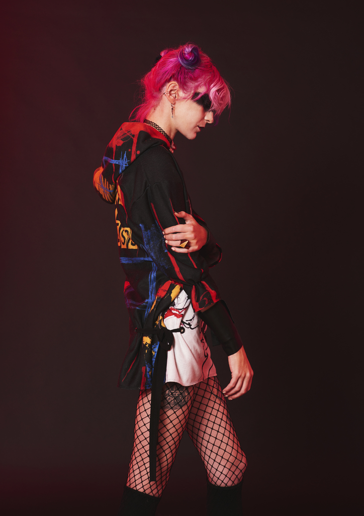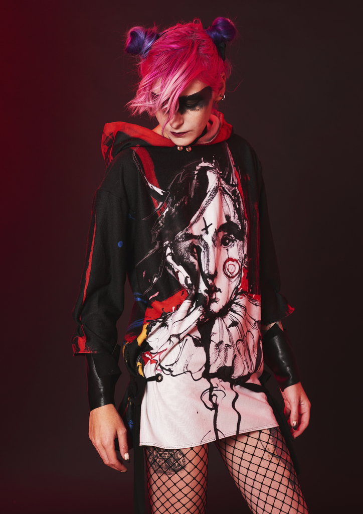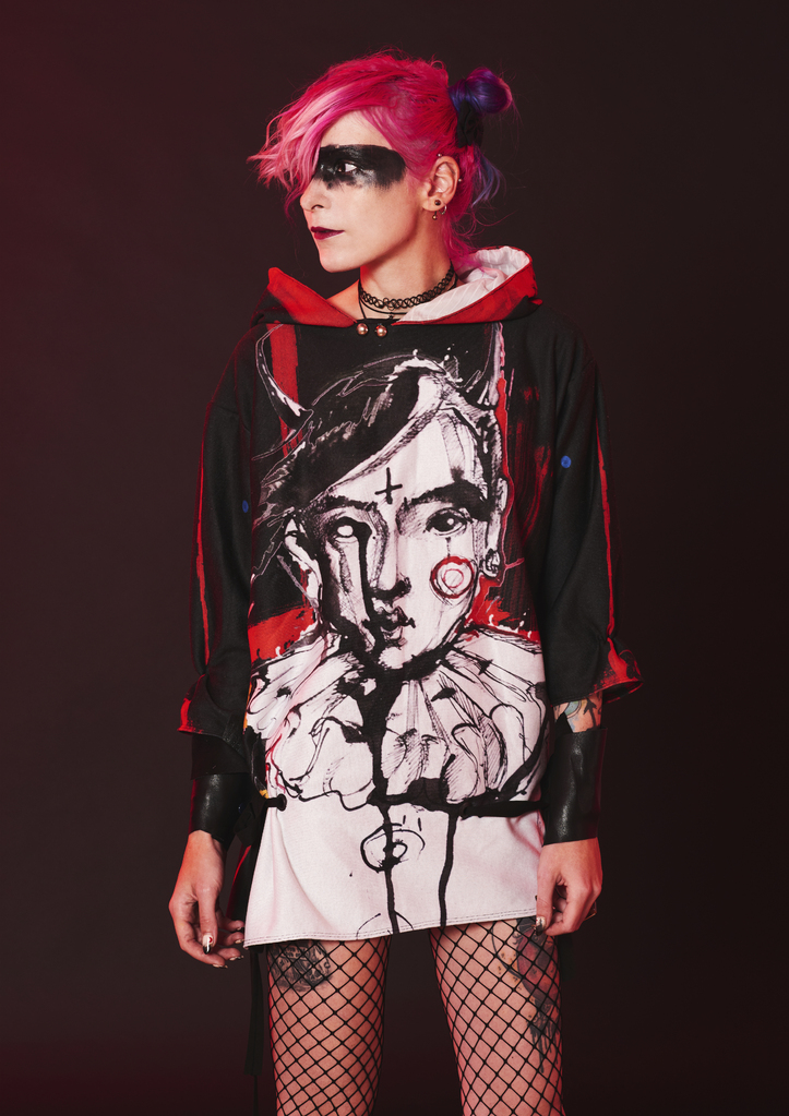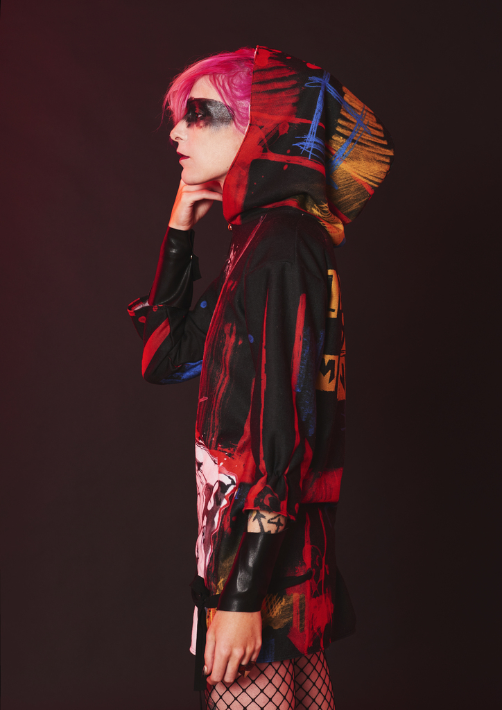 Блузон с качулка и странични връзки от авторски плат - памучно ватирано трико с винтидж ефект. Може да бъде поръчан с по-голяма дължина и да се носи като рокля. Моделът на снимката е мерки 79/59/84 ,170, и е облечен със суитчер ширина обиколка 100 см, дължина 80см.