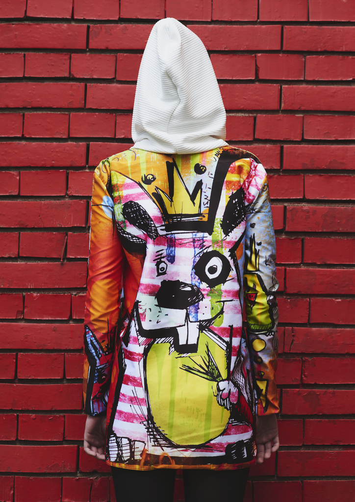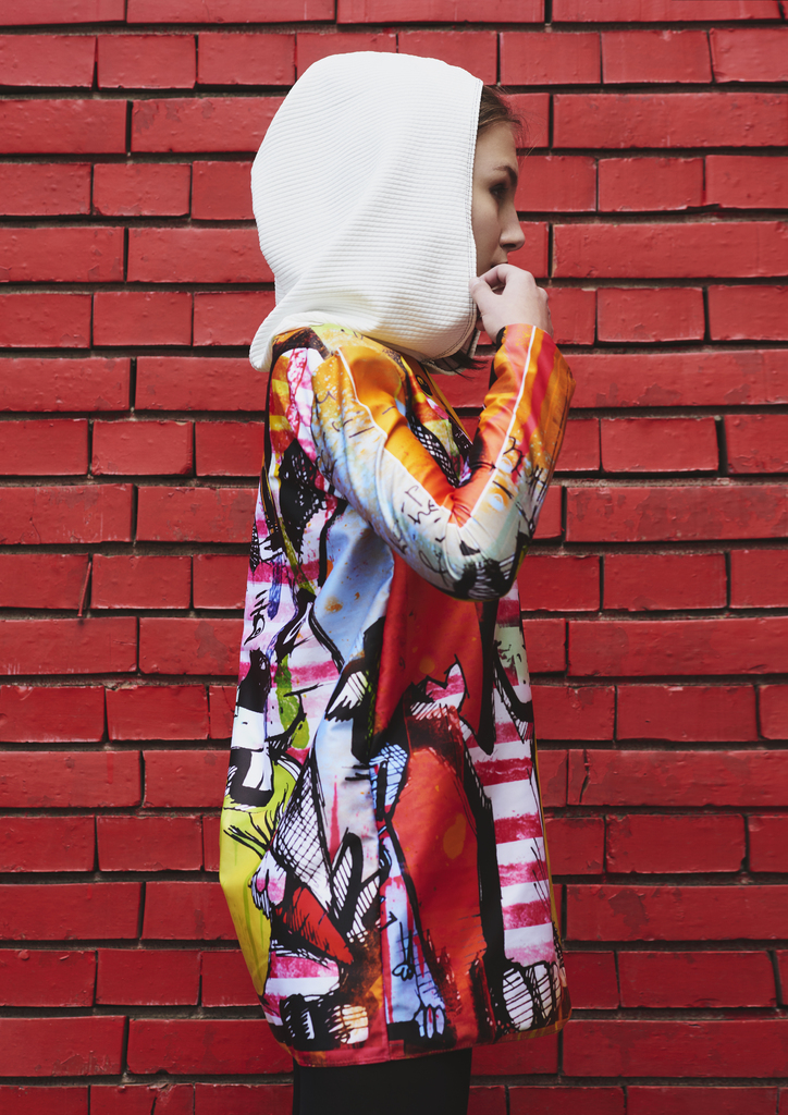 Блузон с качулка, авторски принт двустранен. Може да бъде с къс ръкав и без качулка . Възможен е с всеки принт от моделите рокли и блузи с принт .