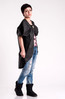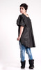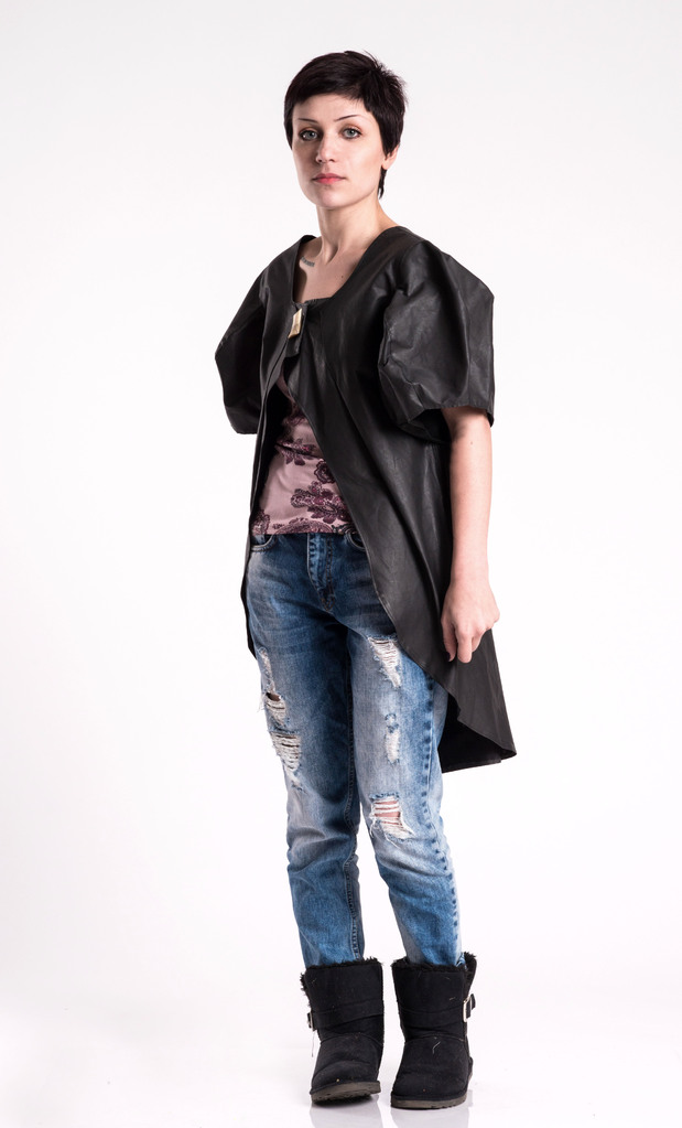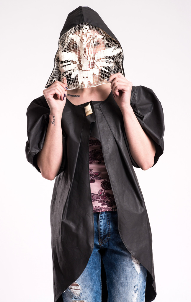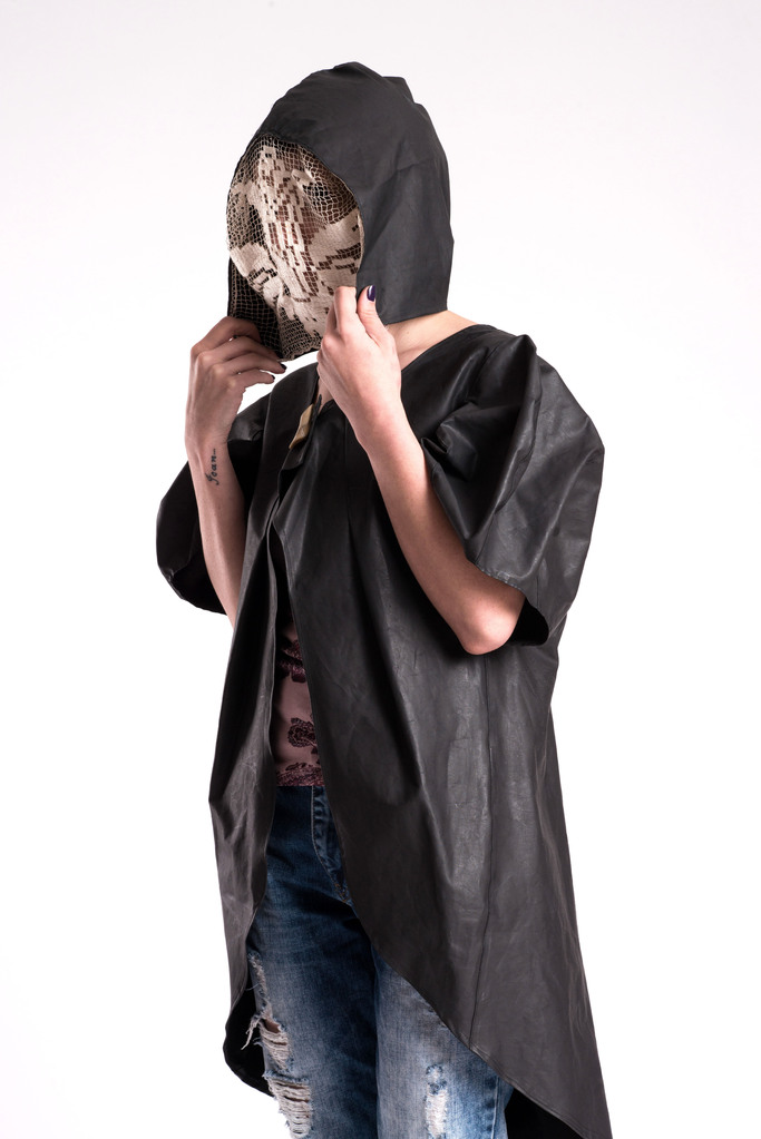 Фрак с големи сферични ръкави от твърда материя с матово покритие. Качулка с ръчно изработени дантели, която не е зашита и може да се ползва само като аксесоар. Ръкавите могат да се носят и с прибрани навътре сектори без обем.
