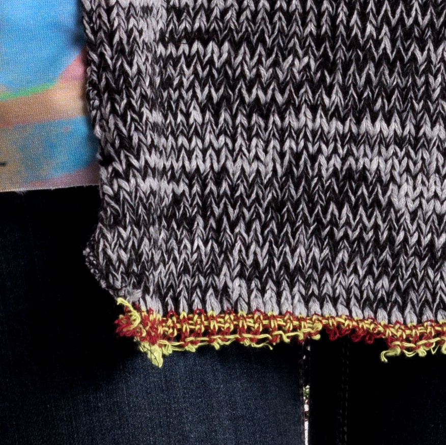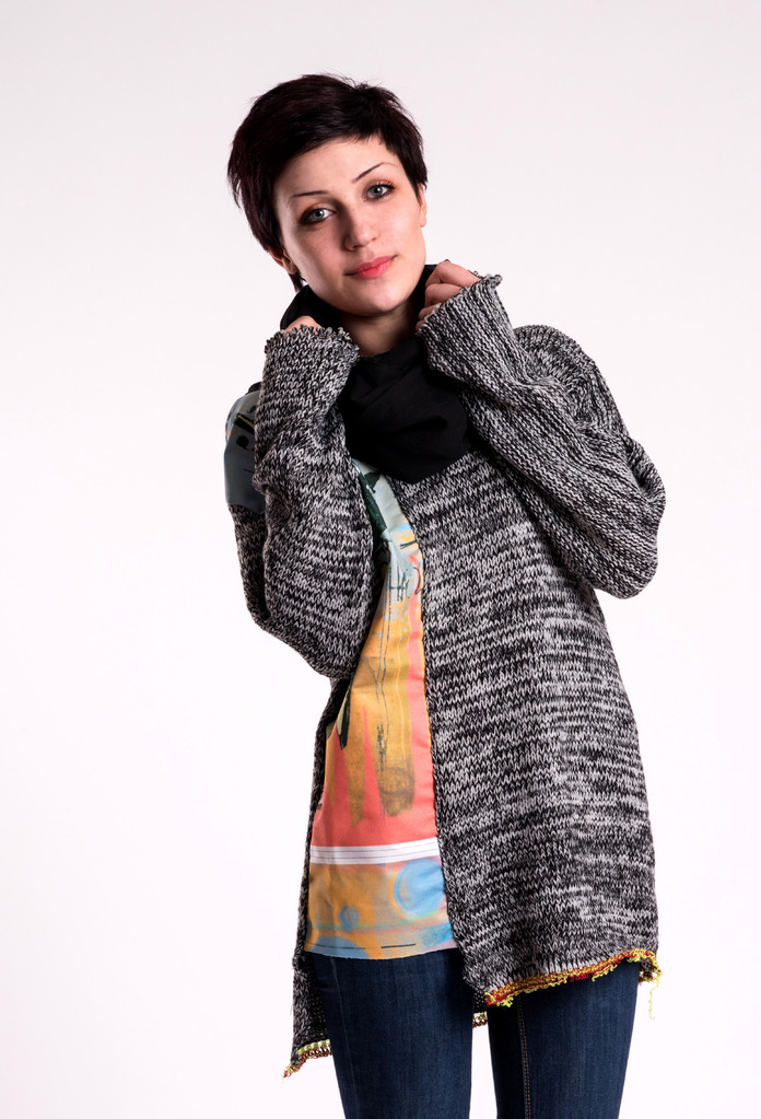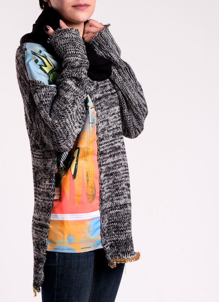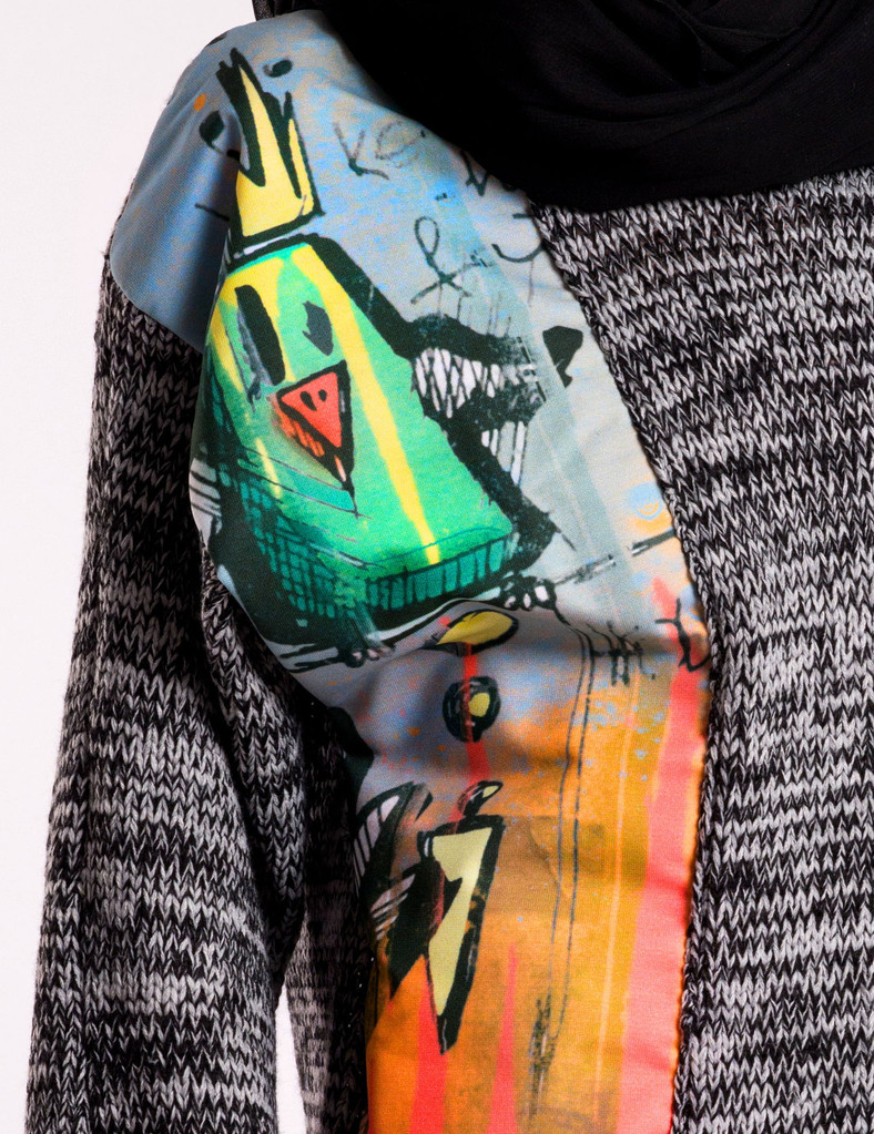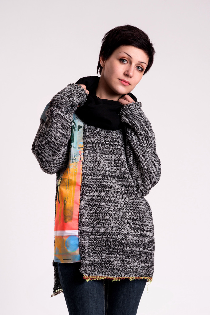 Пуловер от сиво-черно меланжирано трико. Гарнитура - плат с авторска щампа. Шал-яка в черно. Прекрасно допълнение към яке Acid Bunny Jacket.
