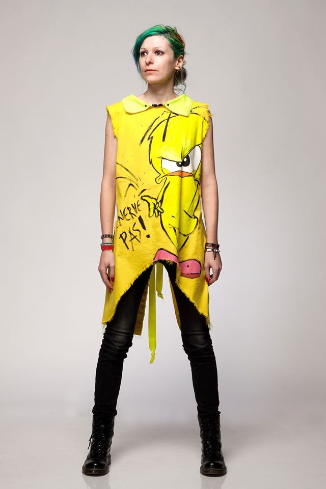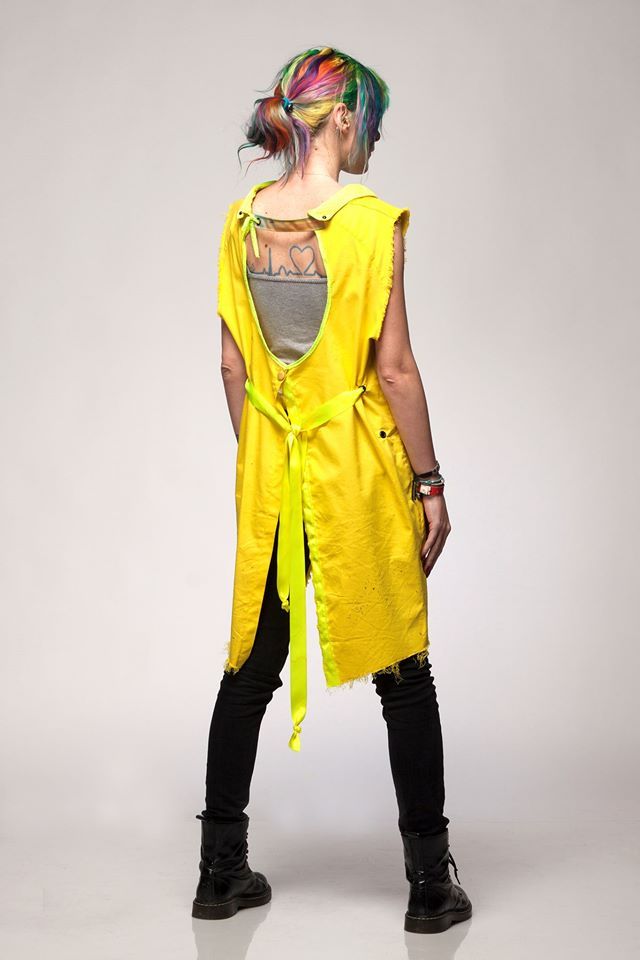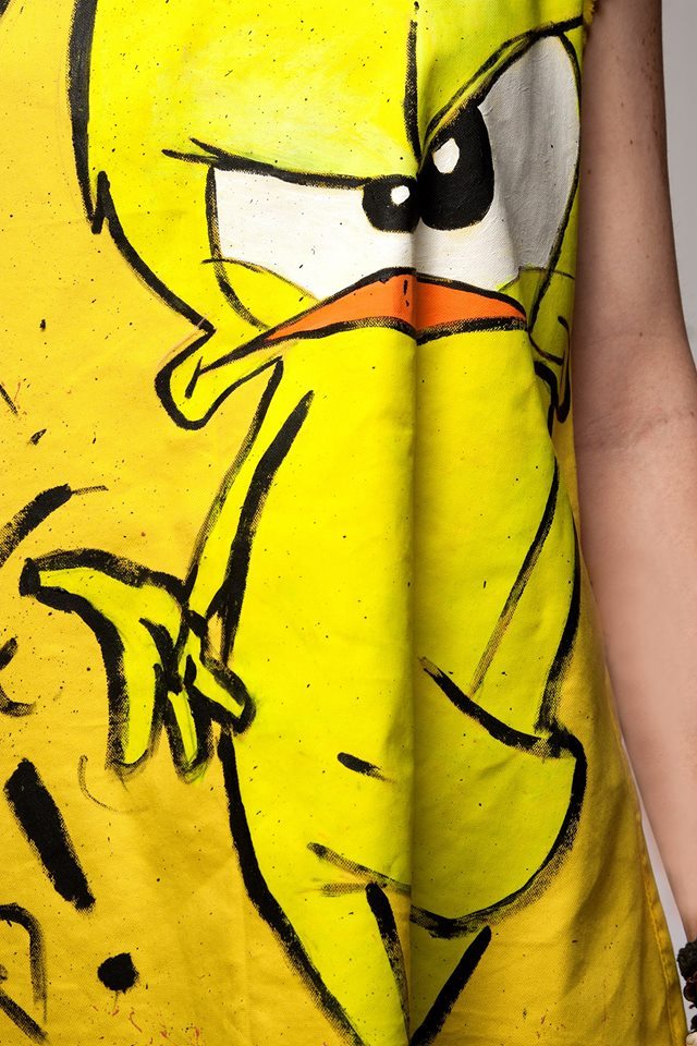 Интересна жълта риза с асиметрична дължина, която може да се носи като туника с асиметрична дължина. Ръчно рисувана картинка отпред и на гърба, която придава леко закачлив вид на дрехата. Усмихнете лятото. Може да се заяви с индивидуална поръчка - време за изработка 5-7 дена.