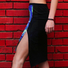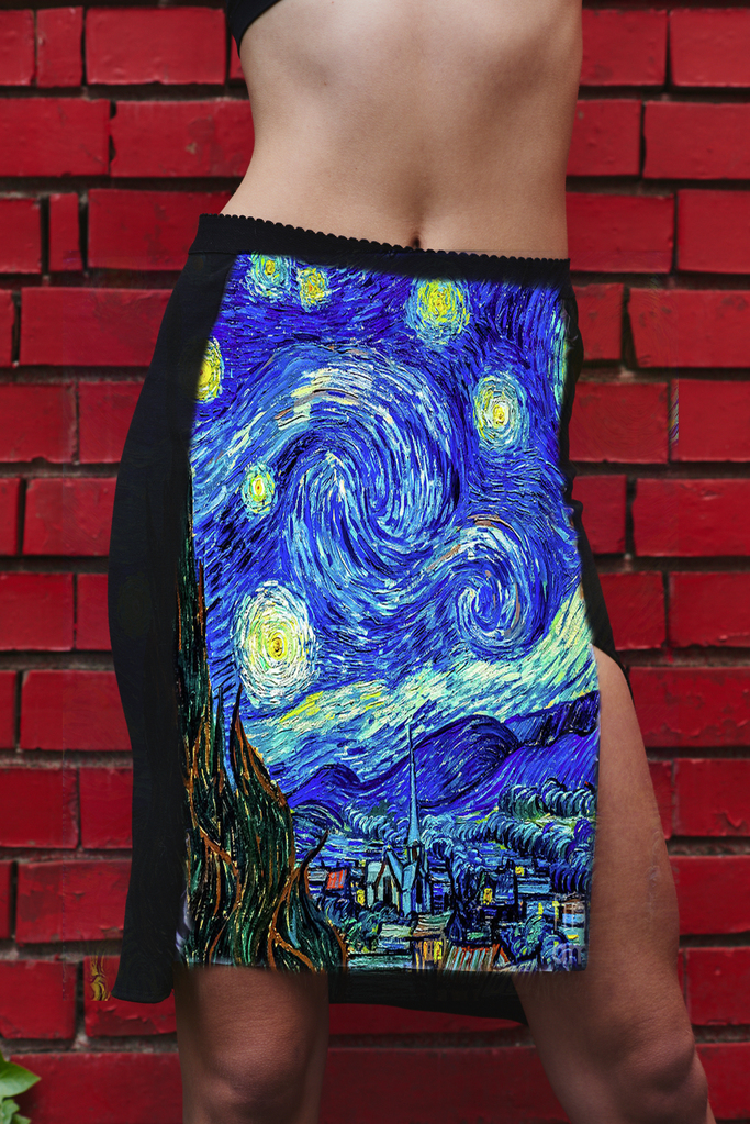 Пола с Принт Starry Night . Предна част на полата принт полиестер леко твърда материя като тънък деним. останалата част яерно плътно трико. Полата е асиметречна с цепка от едната страна.