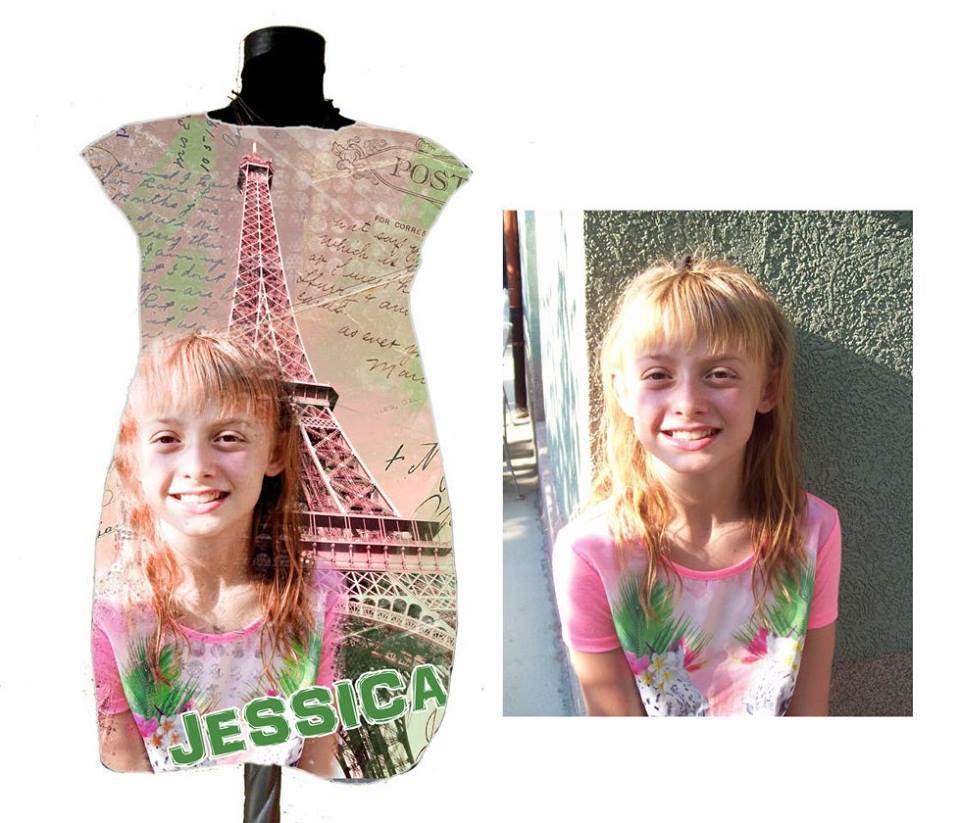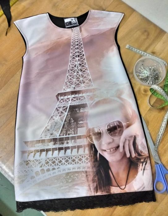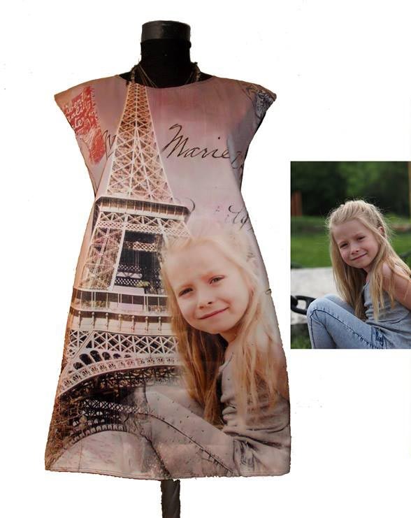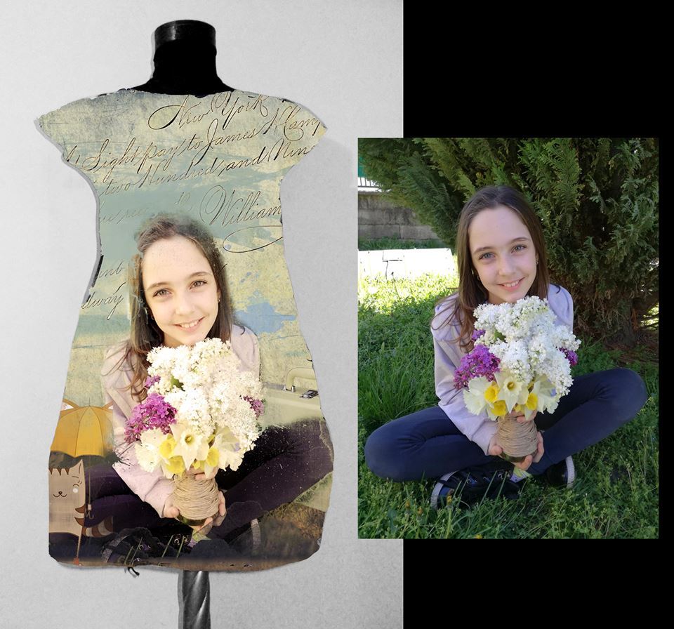 Рокля с фото колаж по идея на клиент . Материал предна част - полиестер . Гръб - разтеглива материя - трико 95 % памук, 5 % еластан. Може да се изработи по индивидуален размер и поръчка. Време за изработка 7- 10 дена дена.