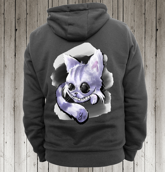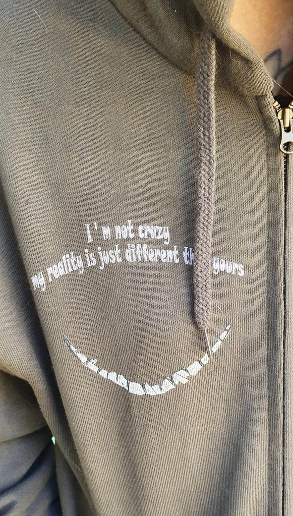 Суитшърт с цип отпред и джобове. Рисунка - принт на гърба Чеширският котарак от Алиса в страната на чудесата. Отпред с надпис : I am not crazy my reality is just different from yours