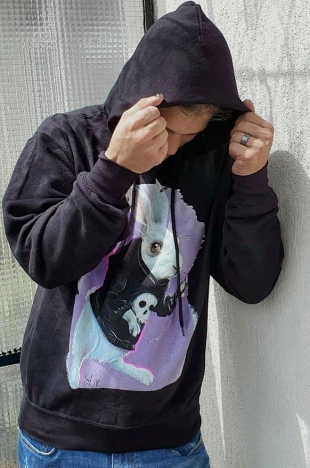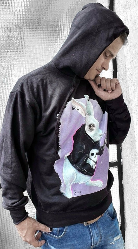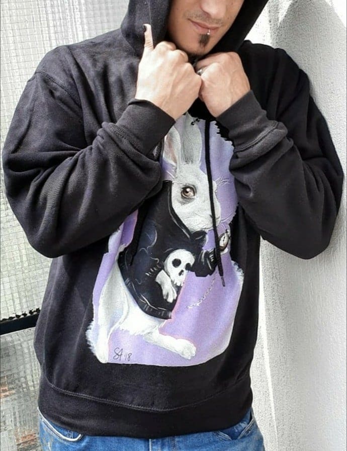 Суитшърт или худи с принт авторска рисунка- Белият заекът от Алиса в страната на чудесата. Може да бъде поръчан в друг цвят  . Моделът е UNISEX . Може да бъде поръчан  модел с цип отпред и  принта може да бъде на гърба.