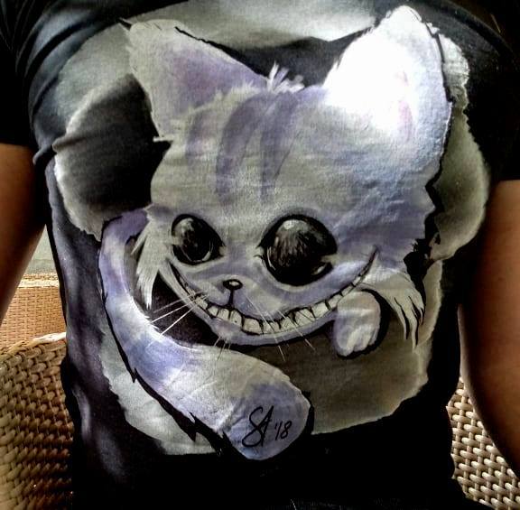 Дизайнерска тениска с авторска рисунка принт ЧЕШИРСКИЯТ КОТАРАК ОТ АЛИСА В СТРАНАТА НА ЧУДЕСТА . Може да бъде изработена в цвят черно , бяло или друг цвят по желание. В полето друго отбележете цвета.