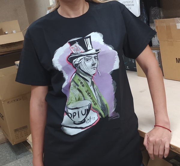 Дизайнерска тениска с авторска рисунка  принт. ЛУДИЯТ ЩАПКАР ОТ АЛИСА В СТРАНАТА НА ЧУДЕСАТА