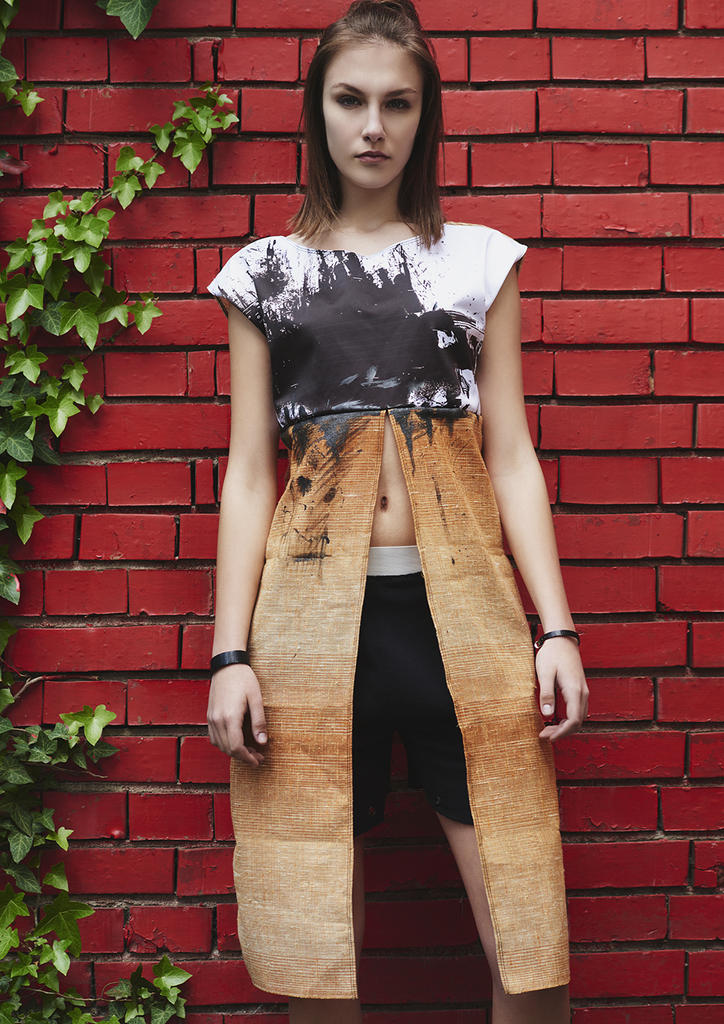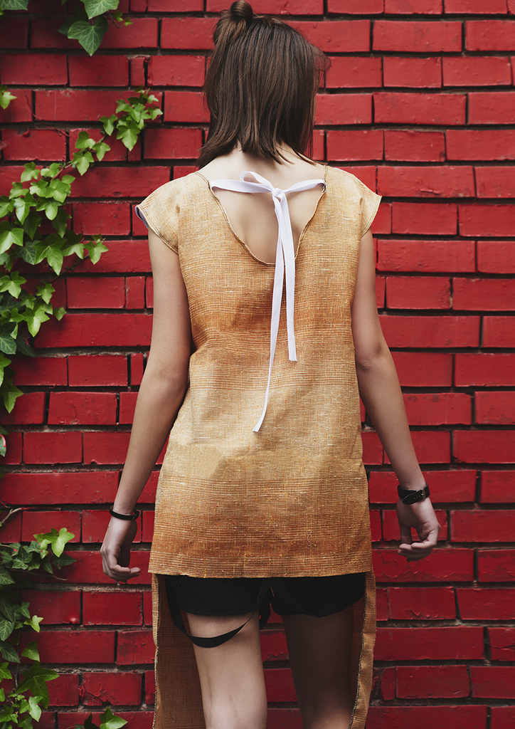 Туника с дълга раздвоена предна чaст и по-къс гръб с панделка. Авторски плат- полиестер на предна горна част. Долна част- лен.
