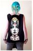 Блуза- елек  с авторски принт . По-дълга предна част, като може да се носи и със завръзването на гърба, а илюстрацията отпред. Материал  трико, гарнитура - плетен PVC.