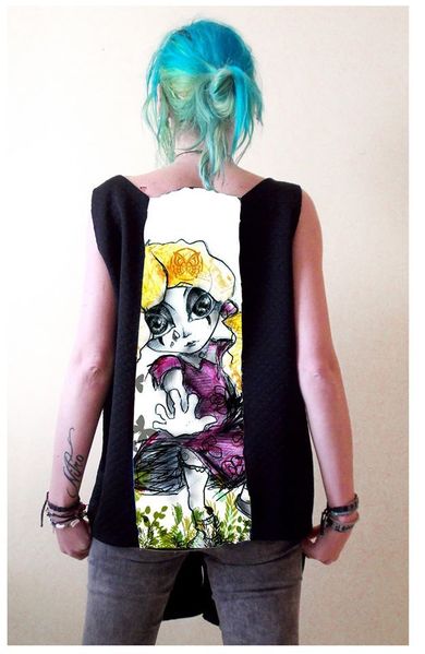 Блуза- елек  с авторски принт . По-дълга предна част, като може да се носи и със завръзването на гърба, а илюстрацията отпред. Материал  трико, гарнитура - плетен PVC.