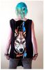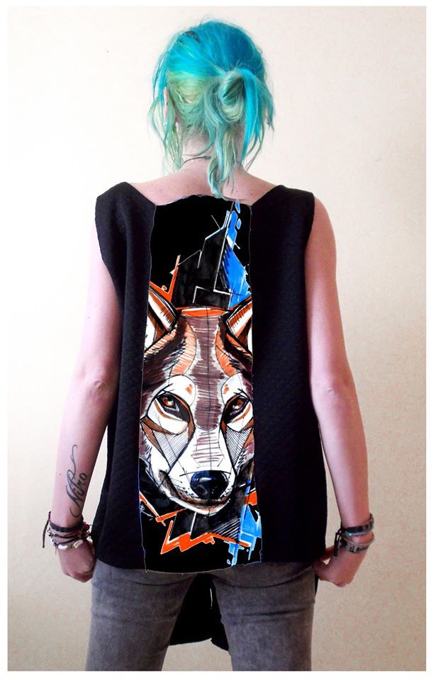 Блуза- елек  с авторски принт . По-дълга предна част, като може да се носи и със завръзването на гърба, а илюстрацията отпред. Материал  трико, гарнитура - плетен PVC.