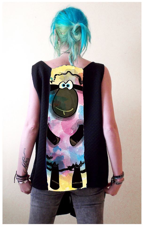 Блуза- елек  с авторски принт . По-дълга предна част, като може да се носи и със завръзването на гърба, а илюстрацията отпред. Материал  трико, гарнитура - плетен PVC.