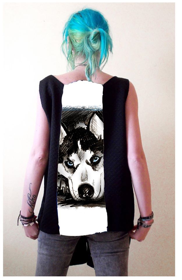 Блуза- елек  с авторски принт . По-дълга предна част, като може да се носи и със завръзването на гърба, а илюстрацията отпред. Материал  трико, гарнитура - плетен PVC.