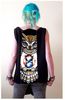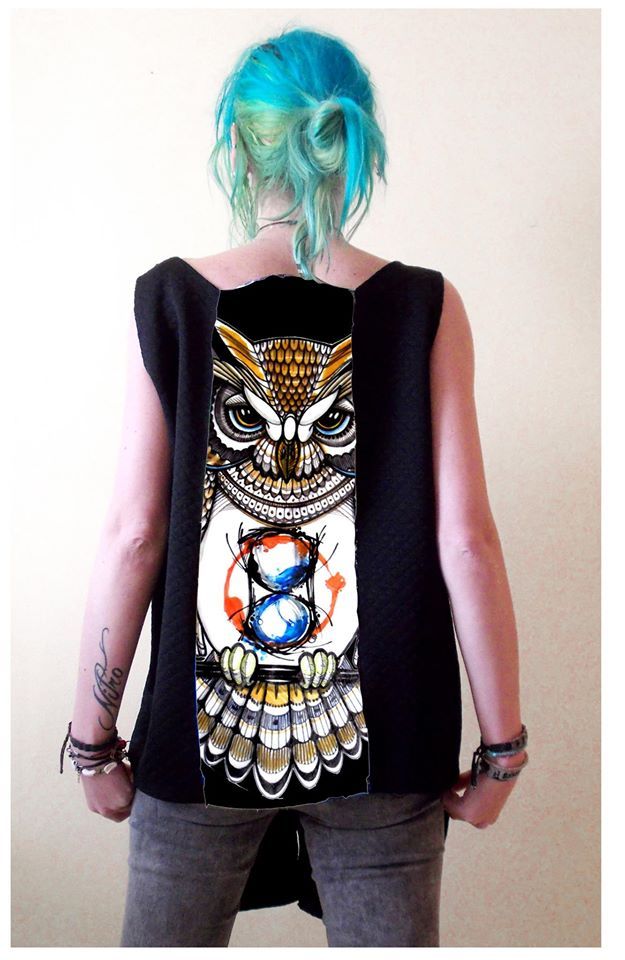 Блуза- елек  с авторски принт . По-дълга предна част, като може да се носи и със завръзването на гърба, а илюстрацията отпред. Материал  трико, гарнитура - плетен PVC.