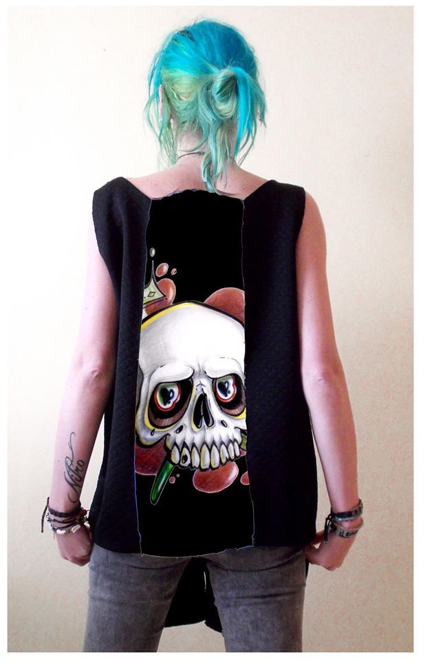 Блуза- елек  с авторски принт . По-дълга предна част, като може да се носи и със завръзването на гърба, а илюстрацията отпред. Материал  трико, гарнитура - плетен PVC.
