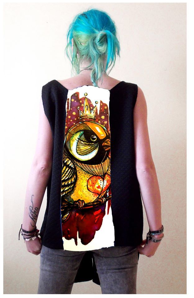 Блуза- елек  с авторски принт . По-дълга предна част, като може да се носи и със завръзването на гърба, а илюстрацията отпред. Материал  трико, гарнитура - плетен PVC.